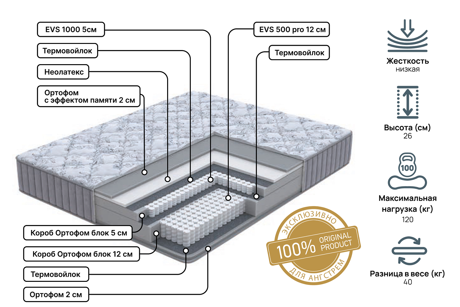 Высокий односторонний матрас премиум класса с низкой жесткостью, обеспечивает неповторимый уровень комфорта. Благодаря современным материалам с функцией памяти, матрас способен подстраиваться под индивидуальные особенности вашего тела. В основе матраса уникальная система из двух блоков независимых пружин с повышенным ортопедическим эффектом. Нижний пружинный блок состоит из 512 независимых пружин, он обладает ортопедическими свойствами и берет на себя большую часть нагрузки. Верхний блок состоит из 1000 пружин на спальное место, которые равномерно распределяют нагрузку и обеспечивают точечную поддержку тела.