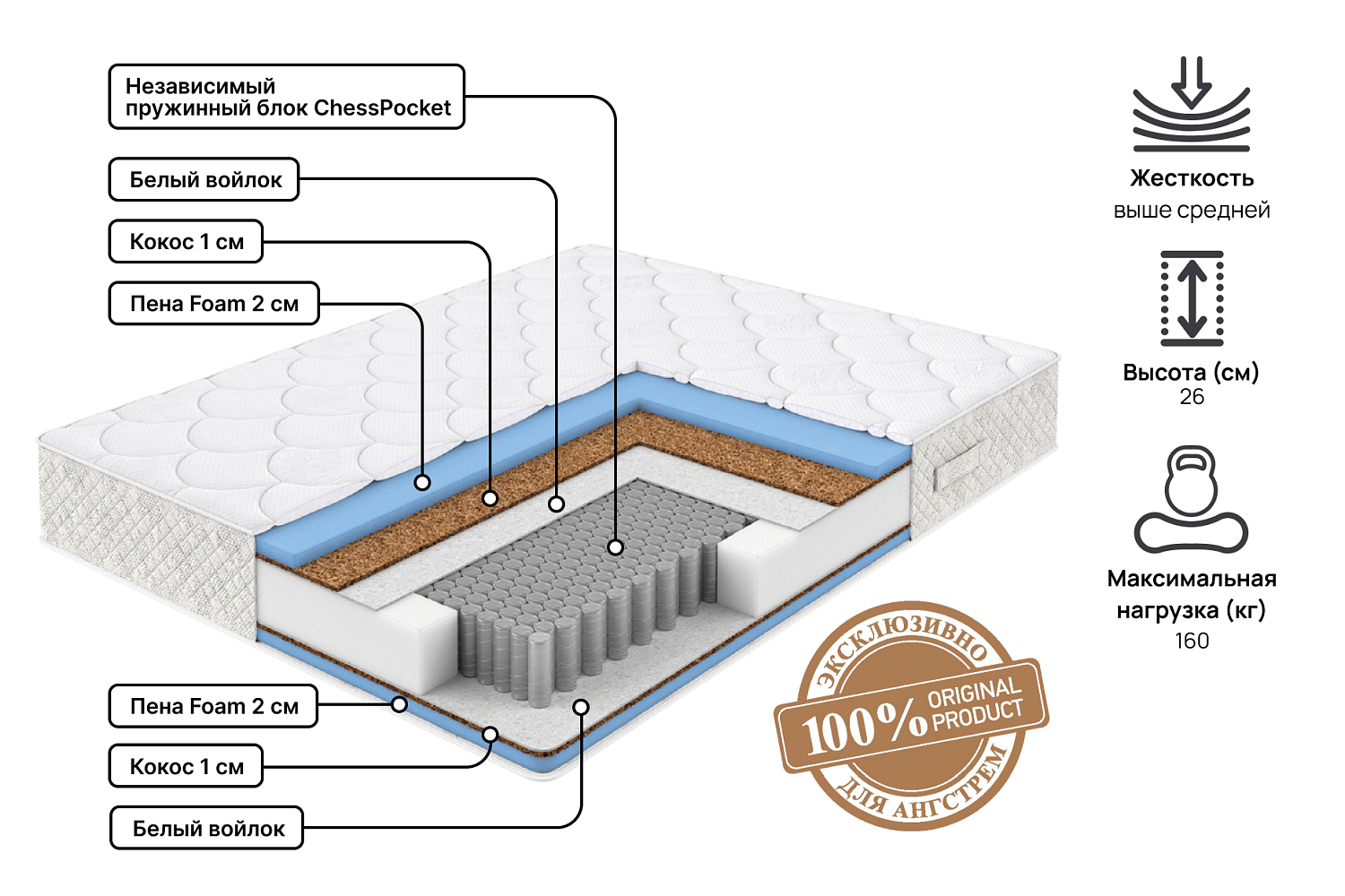 Благодаря блоку независимых пружин ChessPoket, расположенных в шахматном порядке, обеспечивается оптимальная поддержка позвоночника во время сна. Матрас помогает снять нагрузку со спины и поддерживает область поясницы. Каждая пружина работает отдельно от остальных, обеспечивая точечную поддержку тела и минимизируя передачу движений. Кокосовая койра придает оптимальную жесткость, а современный гипоаллергенный материал Foam дарит комфорт. Чехол выполнен из высококачественного трикотажа, простеганного на объемном гипоаллергенном синтепоне.