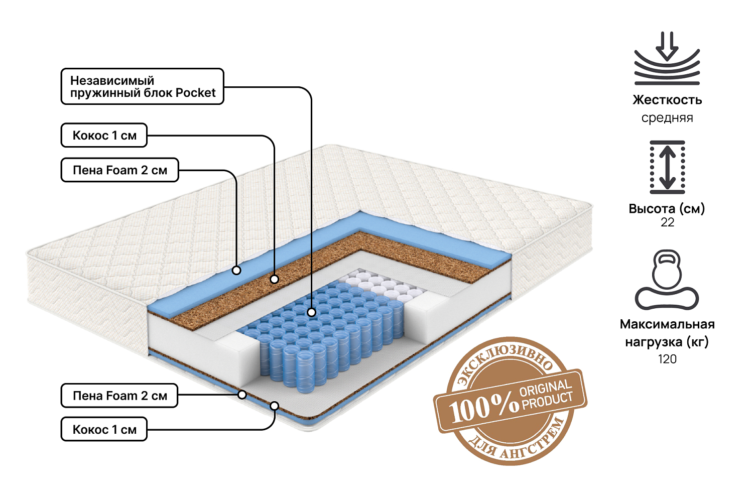 - Матрас с блоком независимых пружин Pocket;